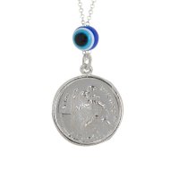 Ασημένιο φυλακτό αυτοκινήτου διπλής όψωςς με τον Άγιο Χριστόφορο και την Παναγία και μπλέ χάντρα ή ματάκι