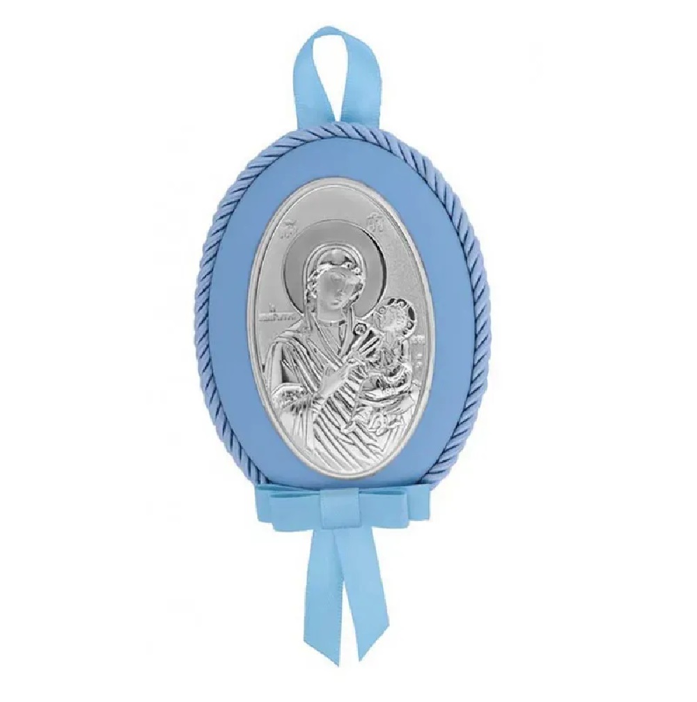 Ασημένια εικόνα κούνιας με την Παναγία Βρεφοκρατούσα σε σιέλ απόχρωση για αγόρι.